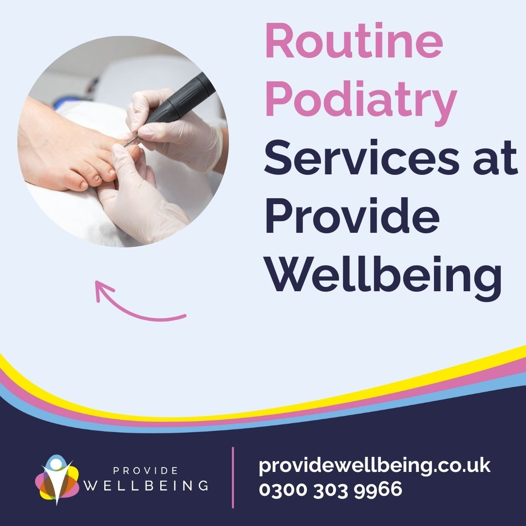Routine podiatry (previously called chiropody) is professional foot care that focuses on comfort and prevention. At Provide Wellbeing, a typical appointment may include: